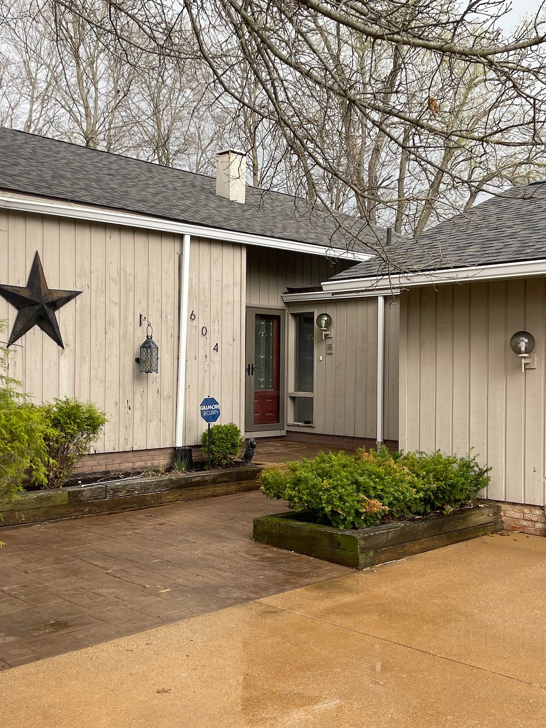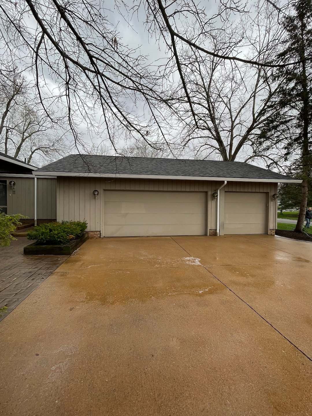 Concrete in this area darkens fast due to organic saturation, especially in driveways surrounded by landscaping and tree lines.