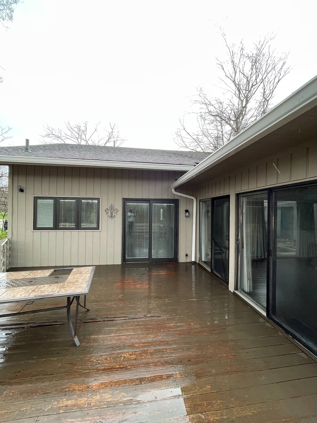 This deck required a low pressure restoration clean to remove embedded biofilm without damaging the wood fibers.
