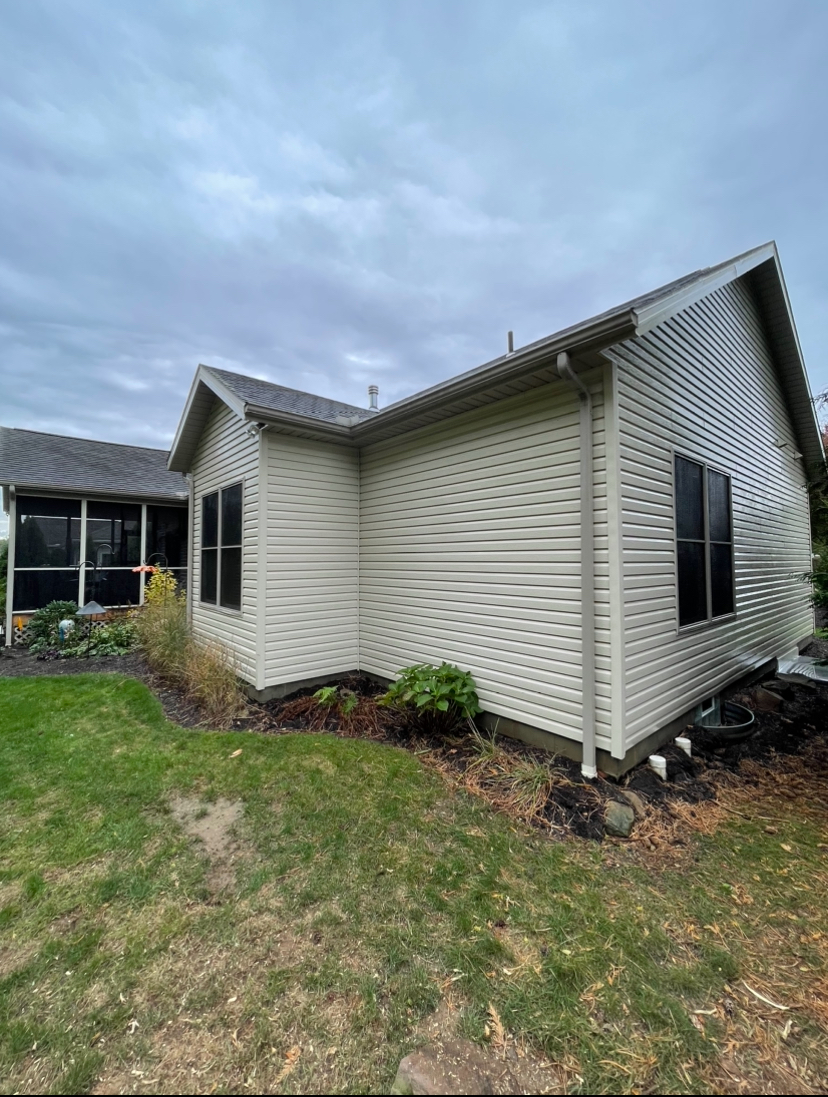 This property featured a screened sunroom, vinyl siding, and concrete surfaces that had been dulled by weather and seasonal exposure. The north side of the house had significant algae buildup due to limited sunlight. Our expert soft washing method removed every trace of organic growth while keeping the siding fully protected and damage free.