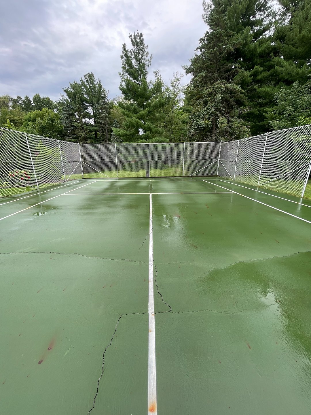 Beachwood properties are often surrounded by heavy tree cover and shaded lawns. Moisture sits longer on the surface, organic debris builds up in the texture, algae spreads across the playing area and lines lose brightness and visibility. Over time this creates a slick, unsafe playing surface. Especially in spring and fall, the buildup can be extreme on north facing courts. Professional tennis court cleaning removes the biological growth at the root instead of just pushing dirt around.